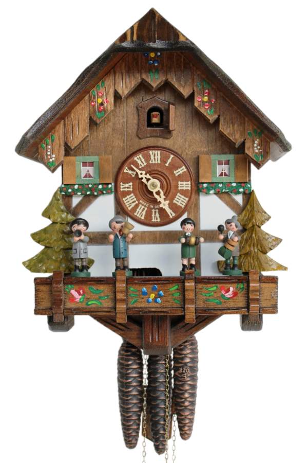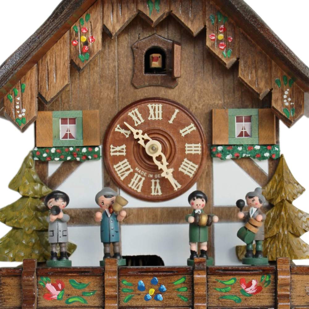 • Handbeschilderd Schwarzwaldhuis met bewegende muzikanten en dennenbomen.