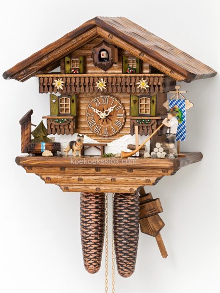 • Koekoeksklok met alpenhoornblazer, hond, waterbak, dennenboom, houtstapels, bijl, edelweiss, stenen en mos.