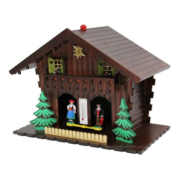 • Weerhuisje van hout met 2 houten dennenbomen, hek, balkon, vensters en edelweiss.